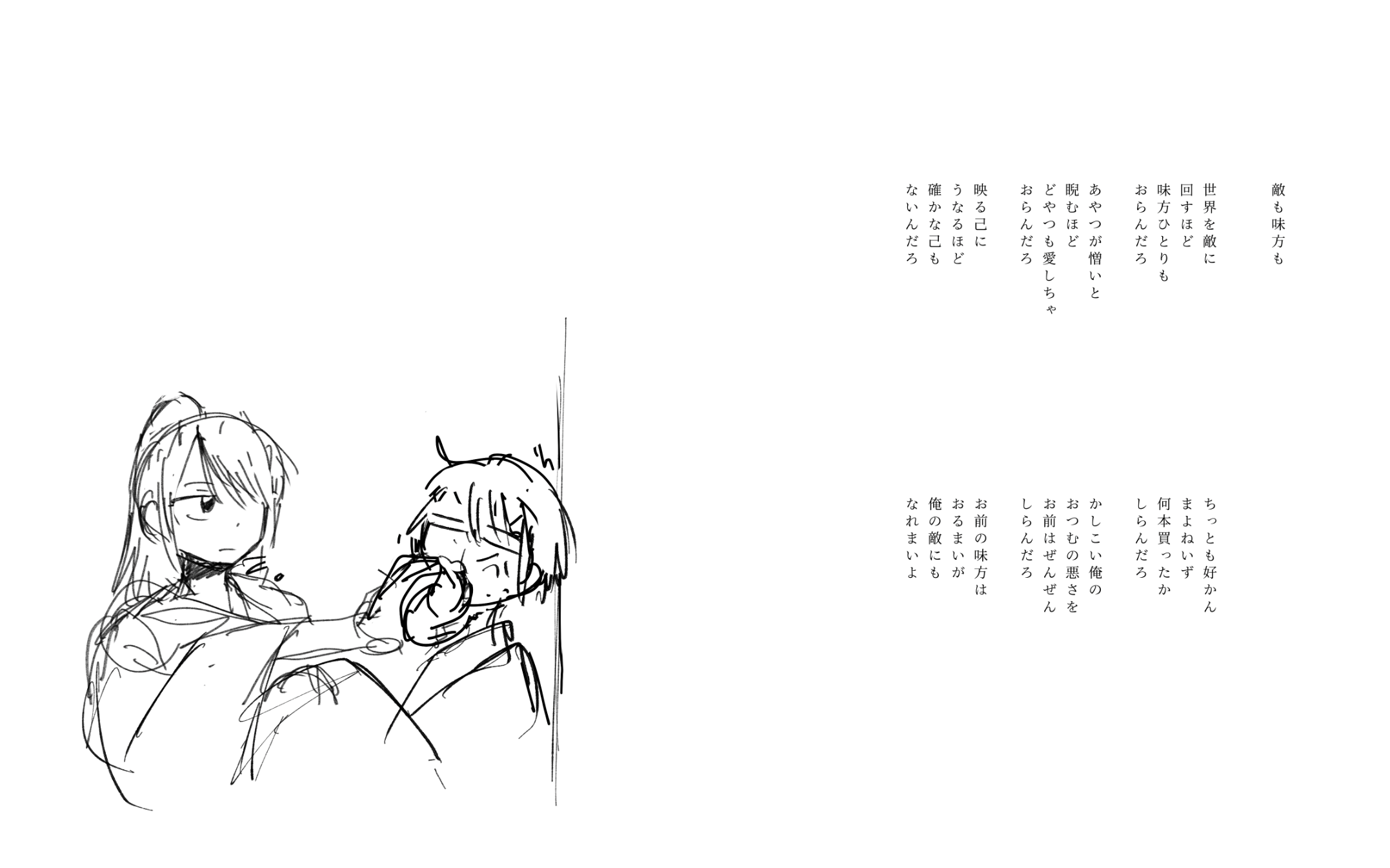 まあアレだ 一番言いたいことは、モノローグを「ポエム」と一笑されることを恐れずにもう詩として組み立ててやろう、とネームを切り直したら満足いく流れが描けてきて嬉しかったですわーいって話なんですが、これから私が発信する中に急にそういうつぶやきやモノローグが出てきてもあんまりビビらないでくださいとお伝えしたかったもので 高尚な歌でも何でもなく、この文の余白を読み、作者の気持ちを答えなさい!ってワケでもないので ただ思ったままがなるべく伝わる言葉を伝えたいリズムで選んでるだけなので 気軽に読んでくださいな