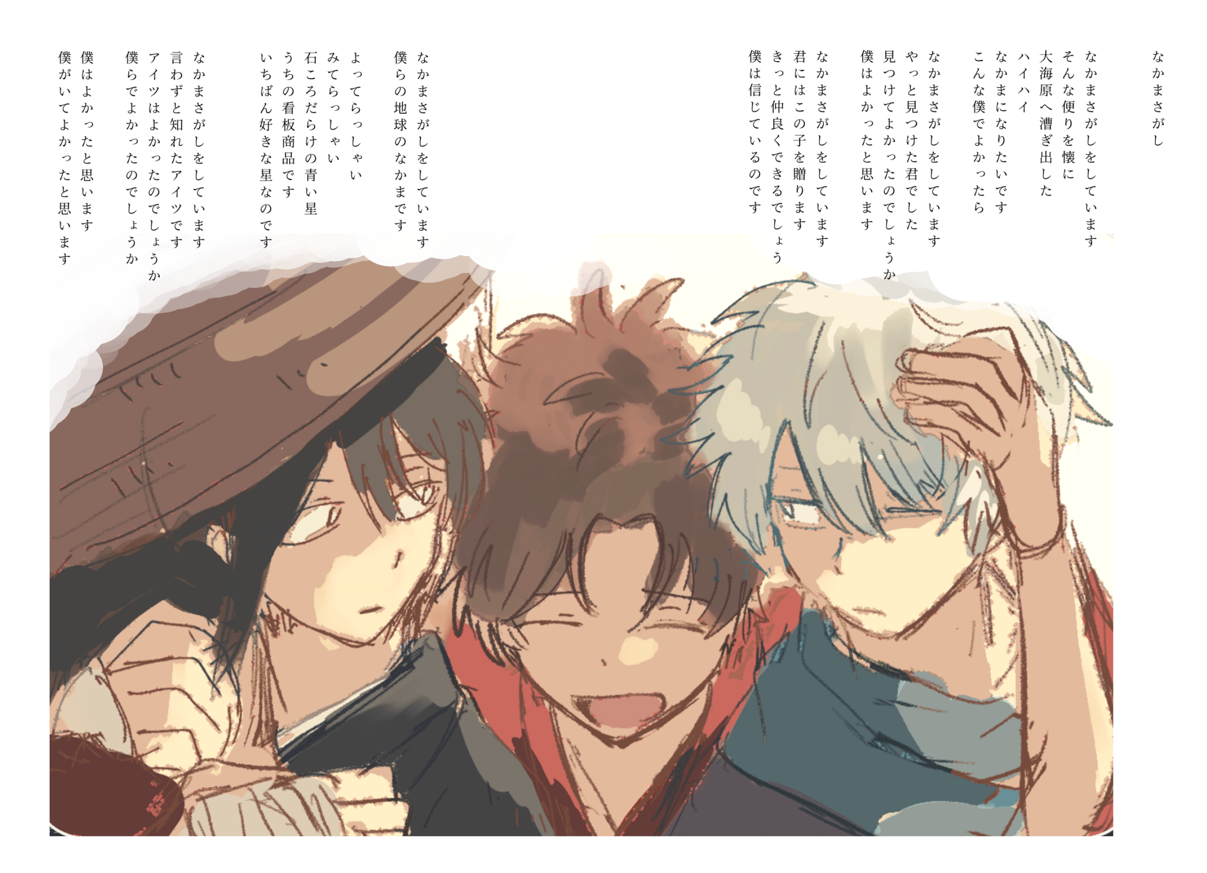 詩人の話で言えば空知さんはもう正しく詩人だと思ってる 「君達はコロナのせいにし放題」とか「気負わず横でも向いてください」とかまっすぐに詩だよね 普通に歌作って欲しい 許斐さんみたいに歌いません?