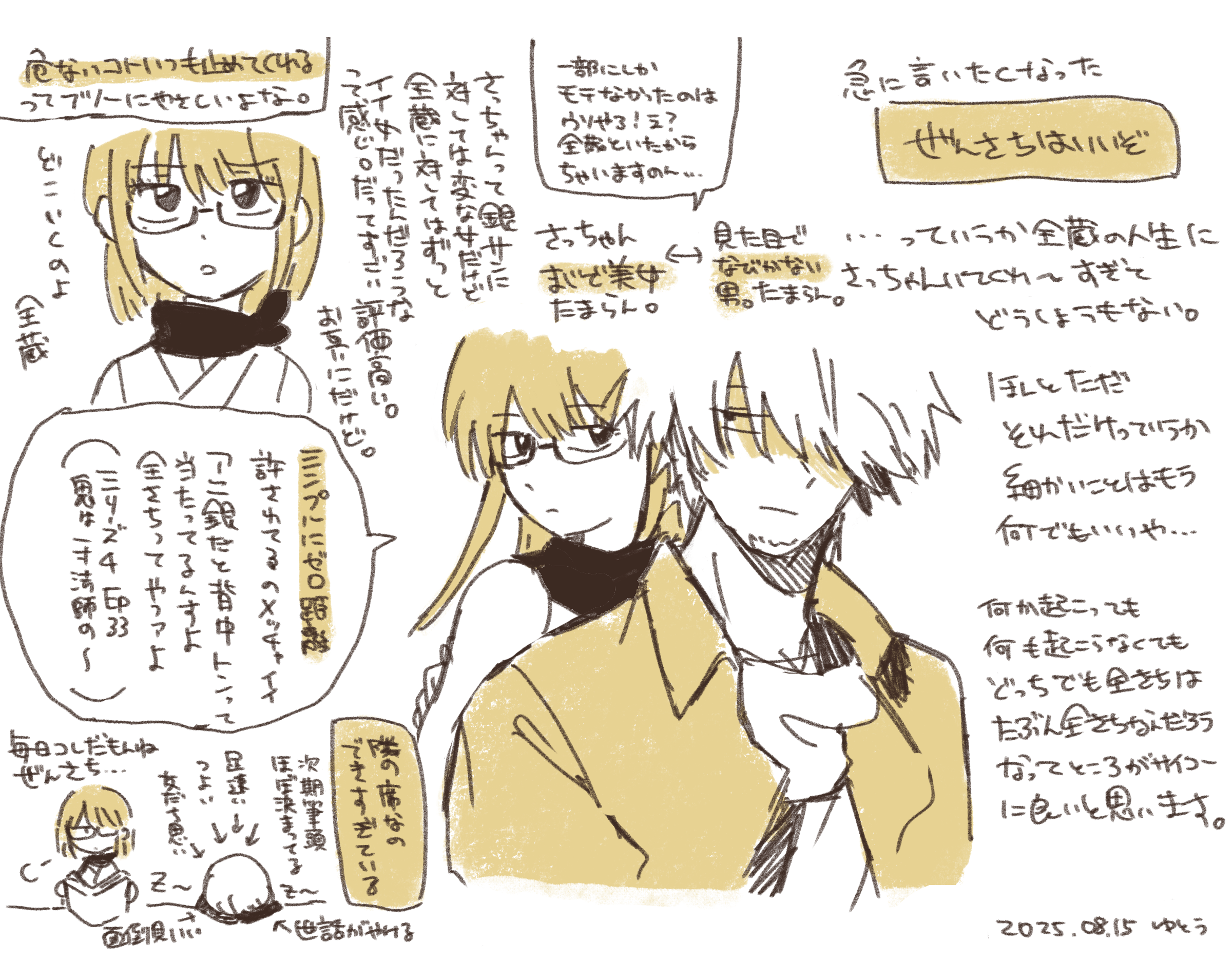 そんな私はここ最近ちょっと体調がマシになってきて、なんか夏休みの自由研究的に自分用に本にしたい話を描いちゃろうと思ったのですが、案の定内容多くなってきたので夏休み中には無理かも…でも銀桂の長編とか冬にやろうとしてたやつよりは現実味がある分量なので、これちまちまやりたいなあと思ってます 何より真面目寄りな全蔵の本が手元にほしいわしは…